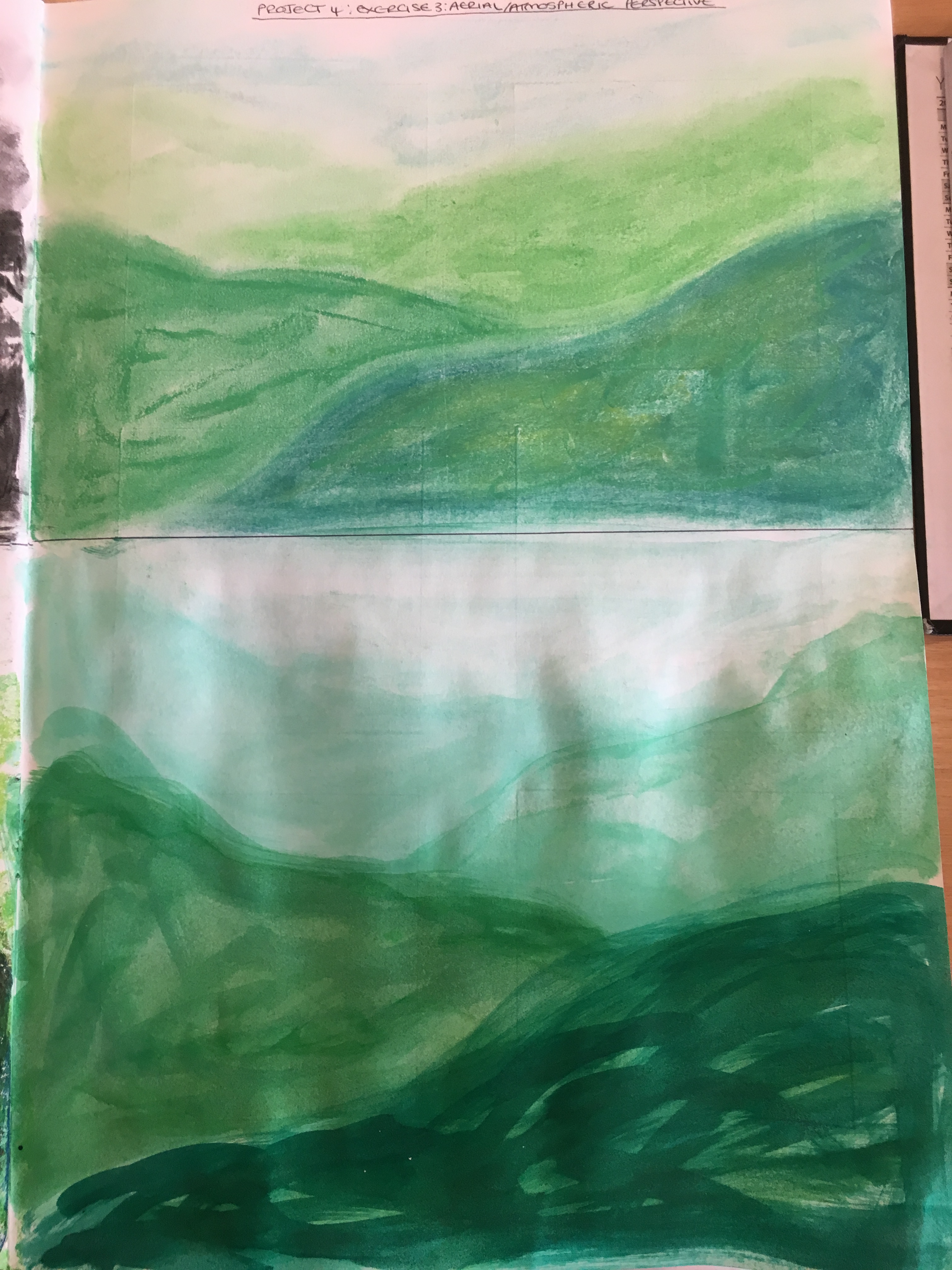 For this exercise, I firstly carried out four experiments in my sketchbook of a set of hills I came across locally. I created atmospheric studies of these hills in charcoal, oil pastel, ink and soft pastels.