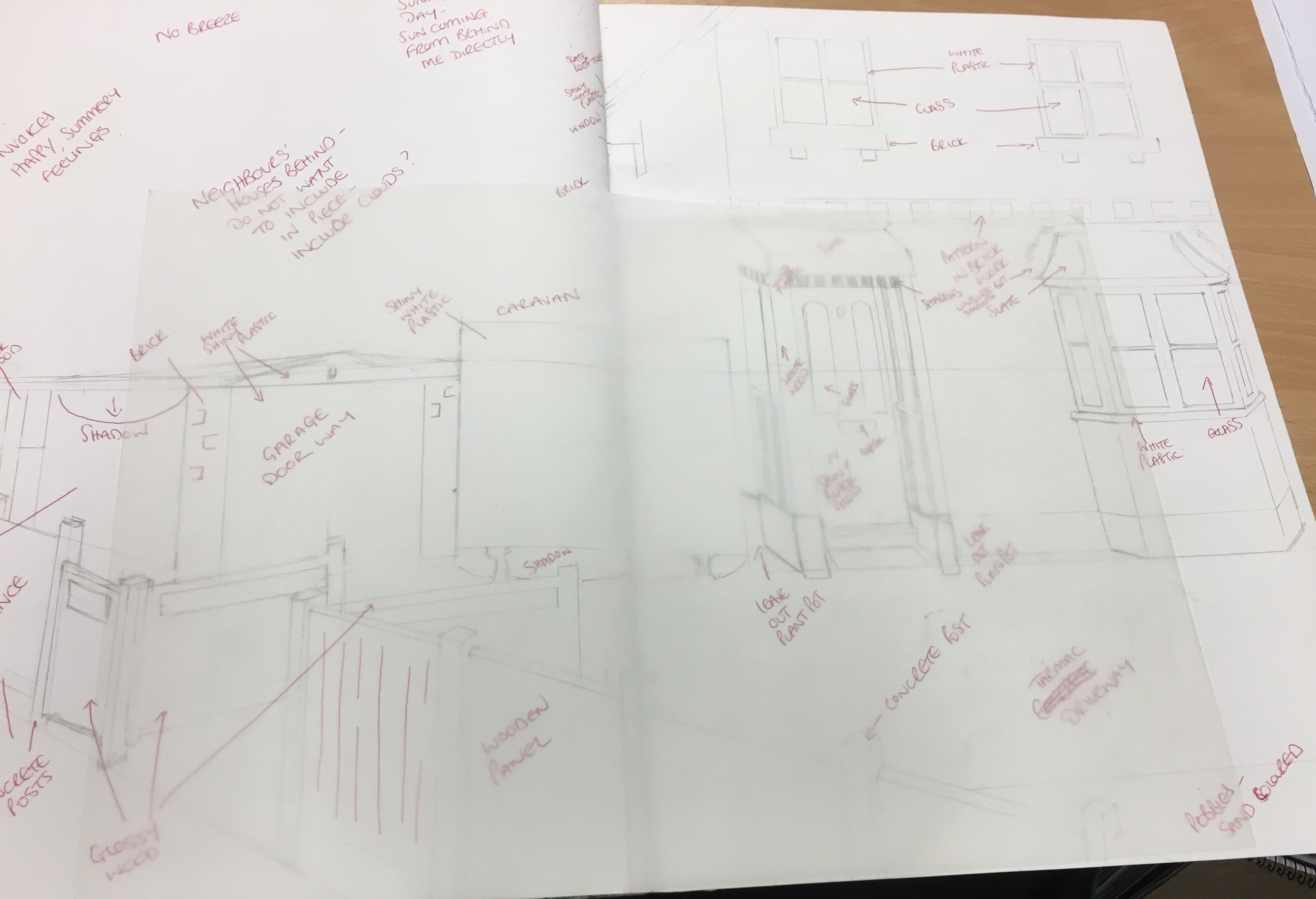 Firstly, I drew a grid on the photograph and then inserted all of the vanishing points. Once I had plotted the basics, starting with the straight line of the corner and ensuring others were accurate too (i.e. the door frame and porch), I then began to draw in the detail, using the grid lines and perspectives to assist me.