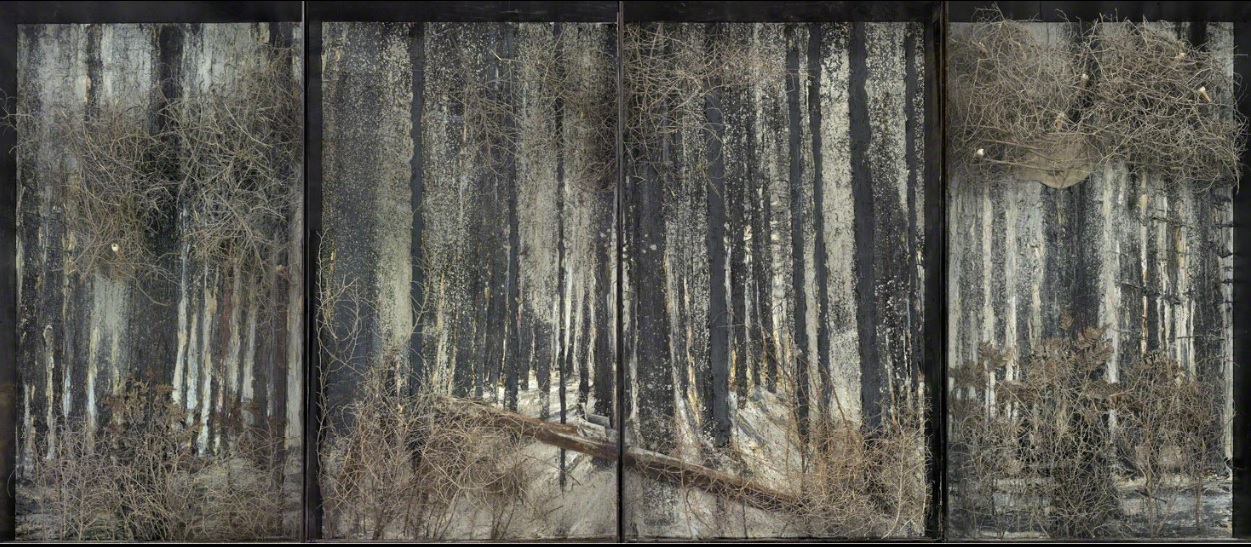 Fig. 22. Kiefer, A (2010) Winterwald [oil, emulsion, acrylic, shellac, ash, torn bushes, synthetic teeth and snakeskin on canvas in glass and steel frames] At: https://www.artsy.net/artwork/anselm-kiefer-winterwald-1 (Accessed on 23 August 2019)