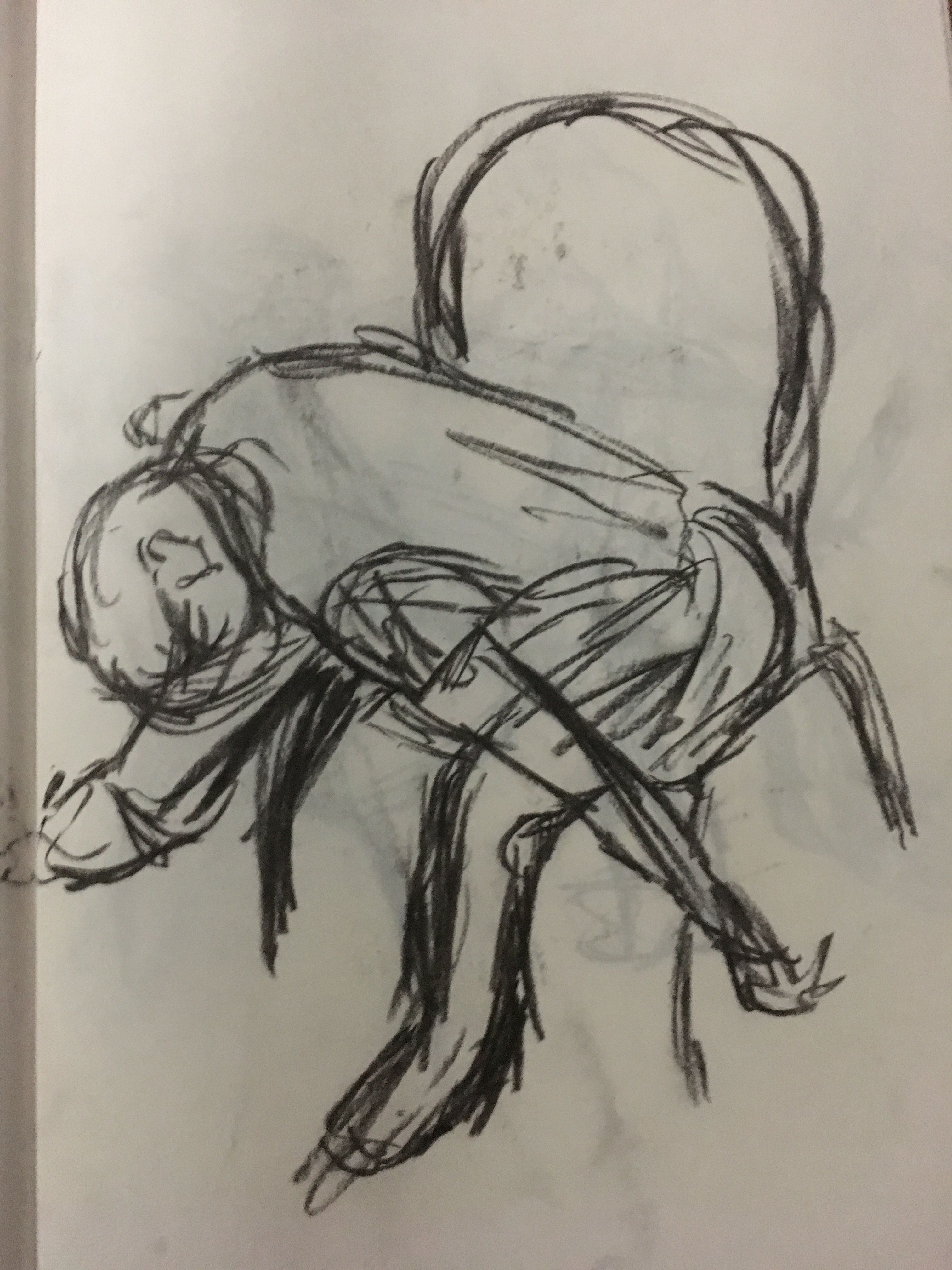 I began each sketch by drawing a simple line through the middle of what would become the body, extending it down, up and across for the arms and legs, depending on their positions. I then moved on to drawing basic shapes for the different parts of the body , after which I worked on building the actual shape of the outline I could see, having decided to learn from my error with the towel in the first exercise. I also – whilst admittedly only very quickly – tried to bear in mind the model’s bone structure and muscle movements to help me measure things out as accurately as I could in the short time available.