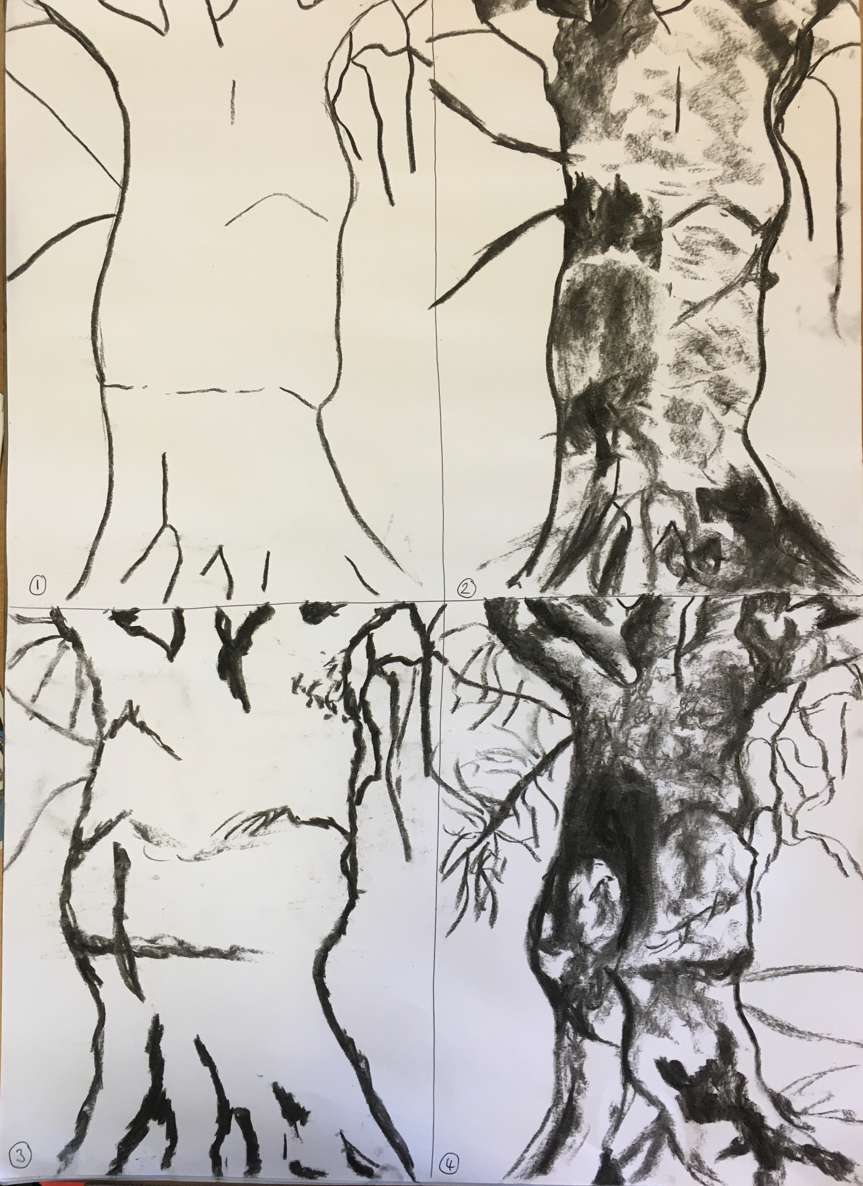 For this exercise, I decided to use a piece of A2 paper and divided it roughly into four (I didn’t measure this, I just drew a line roughly where I thought the centre was both vertically and horizontally). I walked around my local park and settled upon this tree for this exercise. I followed the instructions for the exercise but found them rather frustrating as the first and third instructions seemed almost identical, as did the second and fourth. I carried on regardless and am actually rather pleased with the outcome. I tried to stay very basic in my first and third sketches, focusing mostly on the outline, as instructed in my course manual, and then included more detail of the shadow in blocks of charcoal for the second, but with no real regard for the textures etc, trying to take note of my tutor’s comments in my feedback for Part 2 to try to use patches of tone as opposed to blending too much. For the fourth piece, I tried to show the shadows, as well as the textures of the mossy areas of the tree and also drew in more of the finer branches. I tried to stay rather fluid and quick within my sketches and was actually rather pleased with the fourth and final piece. I found I did not really look at my page for the first and third sketches as much as I did the second and fourth, but I think this was because I wanted to place the areas of shadow and texture as accurately as possible, whereas when it was just the outline, I was not as focussed on getting things in precisely the correct place.
