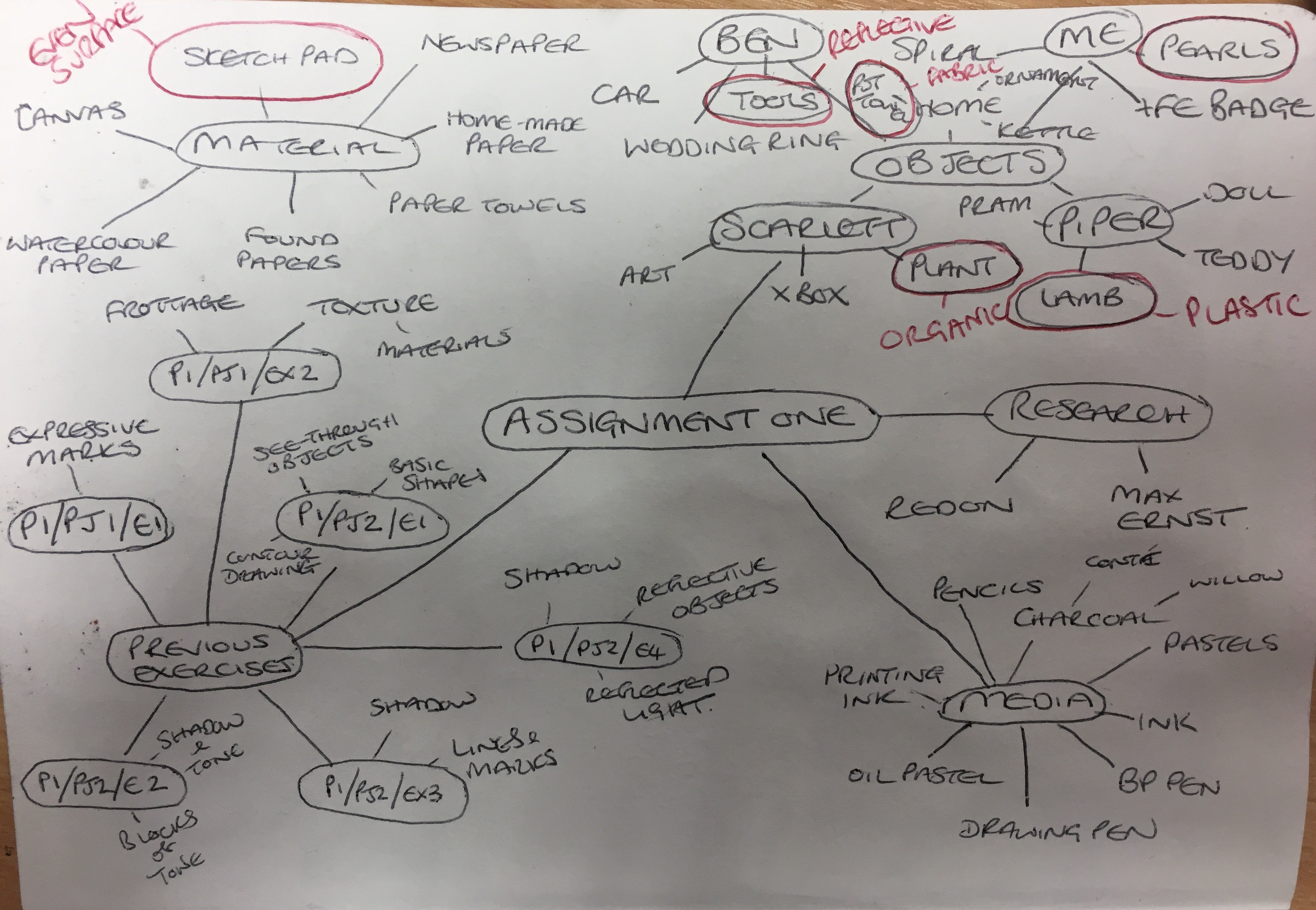 To begin this assignment, I decided to work through my previous exercises in coming up with my main piece. I began by working out what I wanted to draw and why by creating a mind map: