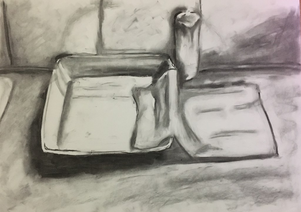 Besides a few issues with the structure of the objects, I was actually rather pleased with the final result as I think I caught the shading rather well. I had a comment as to the kitchen tiles and that they were rather obvious in their description. I noticed when looking back at the end that the shape of the square bowl could have been much better laid out and made to look much more realistic with some more lighter and darker areas due to the reflective surface which, again, I think is a result of not measuring or taking time and care in the planning of the piece. I also think there is a large element of ‘practice makes perfect’!