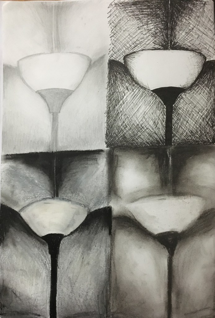 I carried out my inverted piece and was rather pleased with the end result. I don’t think it was immediately obvious that it was a lamp – in fact, I even posted the picture in a group on social media and received a comment from someone believing the piece to be a glass! I found this rather comical – I could have been upset or offended etc, but I actually thought it quite amusing and intriguing that someone had seen something in my piece that I had not intended to be there or even seen myself. It gave me a brief insight into just how differently people interpret artwork. I was, however, slightly disappointed in the final outcome due to having, ironically, an inverted issue with not being able to get the intensity I desired, this time in white. I loved the blending of the colours and did this using my fingers to really get into the piece. I think perhaps I could have used fixative and then built the deepest white areas up layer by layer to intensify their vibrancy.